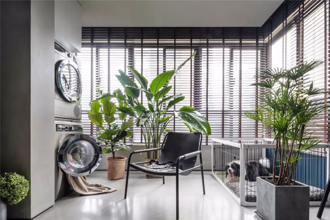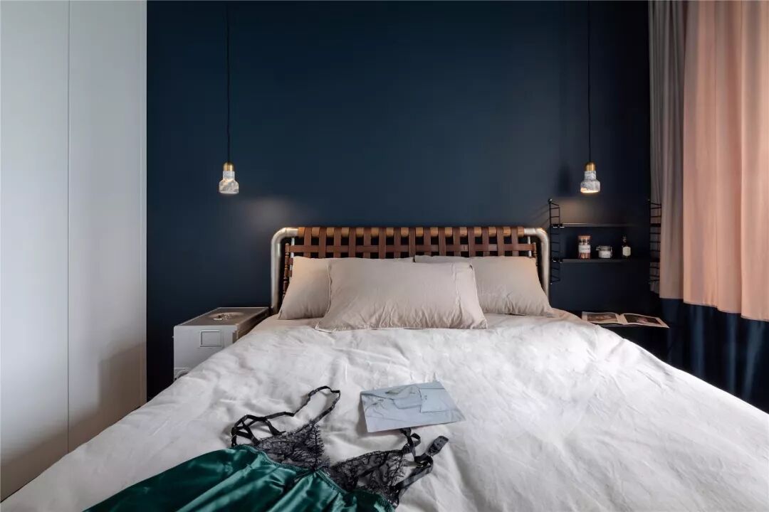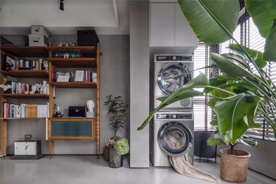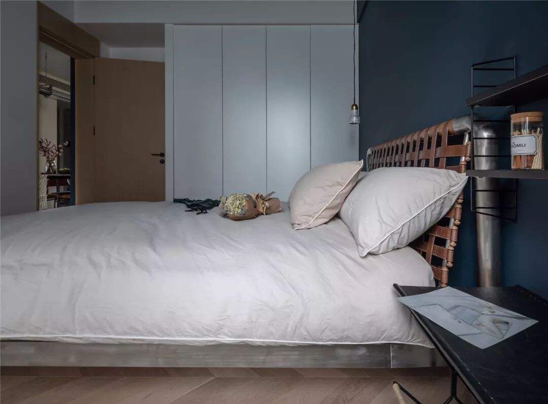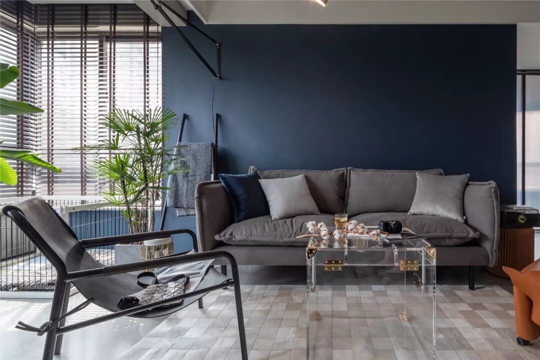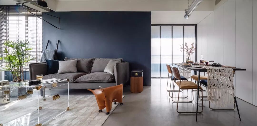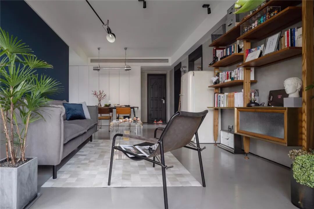 ▲客厅沙发墙以墨蓝色的墙漆,左侧摆上一盆落地盆栽,搭配一张暖灰色布艺沙发,整体给人以端庄沉稳的舒适感。 ▲浅灰色的地面砖,布置上米白色地毯,电视墙旁边还摆放着冰箱,整体空间利用优雅而端庄。 ▲简洁的客厅摆上一张闲适的懒人椅,顶上的灯具也是以导轨灯+射灯的组合,空间显得现代端庄而雅致。 ▲电视墙一个开放的书架,在水泥灰质感的墙面下,布置出一个简洁自然的文艺氛围感。 阳台 ▲客厅打通了阳台,侧边摆着洗衣机+烘干机组合,没有晾晒区的房子,直接就用烘干机烘干衣物,而阳台则是封闭起来纳入到客厅,使得空间更加宽敞。 餐厅 ▲餐厅与客厅连贯的格局,在高冷色调的空间下摆上几张橙色的椅子,让空间清新而活力。 ▲简洁净白的餐边柜,搭配极简大方的餐桌,还有橙蓝配的餐椅,餐桌上丹红的花瓶布置,营造出端庄优雅的用餐气息。 ▲餐厅旁边有个休闲区,以玻璃折叠门隔断,营造出一种简洁温馨的空间氛围。 厨房 ▲厨房也是以水泥灰质感的墙面地面设计,在L形的操作台基础,厨房过道还留了移动操作架与垃圾桶的摆放位置,整体空间实用舒适。 卧室 ▲卧室也是以墨蓝色的床头背景墙,铁艺床+藤椅织篮的靠背,整体简洁现代的设计,给人以安然舒适的休息空间。 ▲床头两侧的吊灯,黑白配的床头柜,还有粉+蓝的窗帘布置,整体空间显得安静优雅而温情。 卫生间 ▲卫生间装了一个简易的成品洗手盆,整体水泥灰质感的墙面,充满了复古调的年代感。 ▲马桶与淋浴区的墙面地面都是以水磨石铺贴,复古调的简约,让空间更加独特情趣。 次卧 ▲简洁的次卧,布置一张铁艺床,床头侧边装了一盏黑色杆壁灯,灰白配的床单布置,小空间也舒适惬意。 休闲室 ▲休闲室整体灰色调的空间,在百叶帘的窗帘下,摆上一张橙色的休闲椅,让空间充满年轻简约与激情的活泼感。