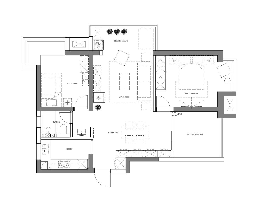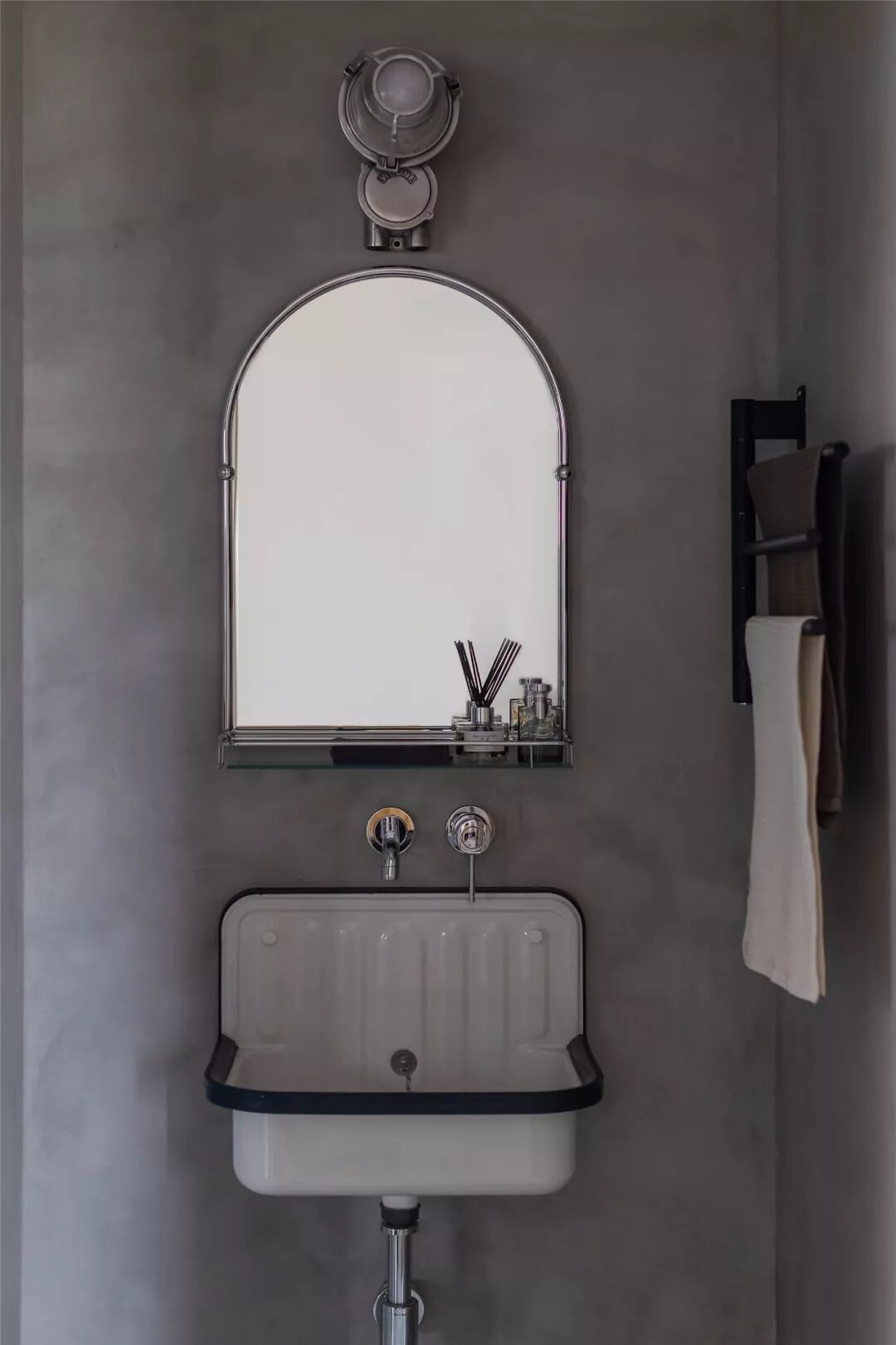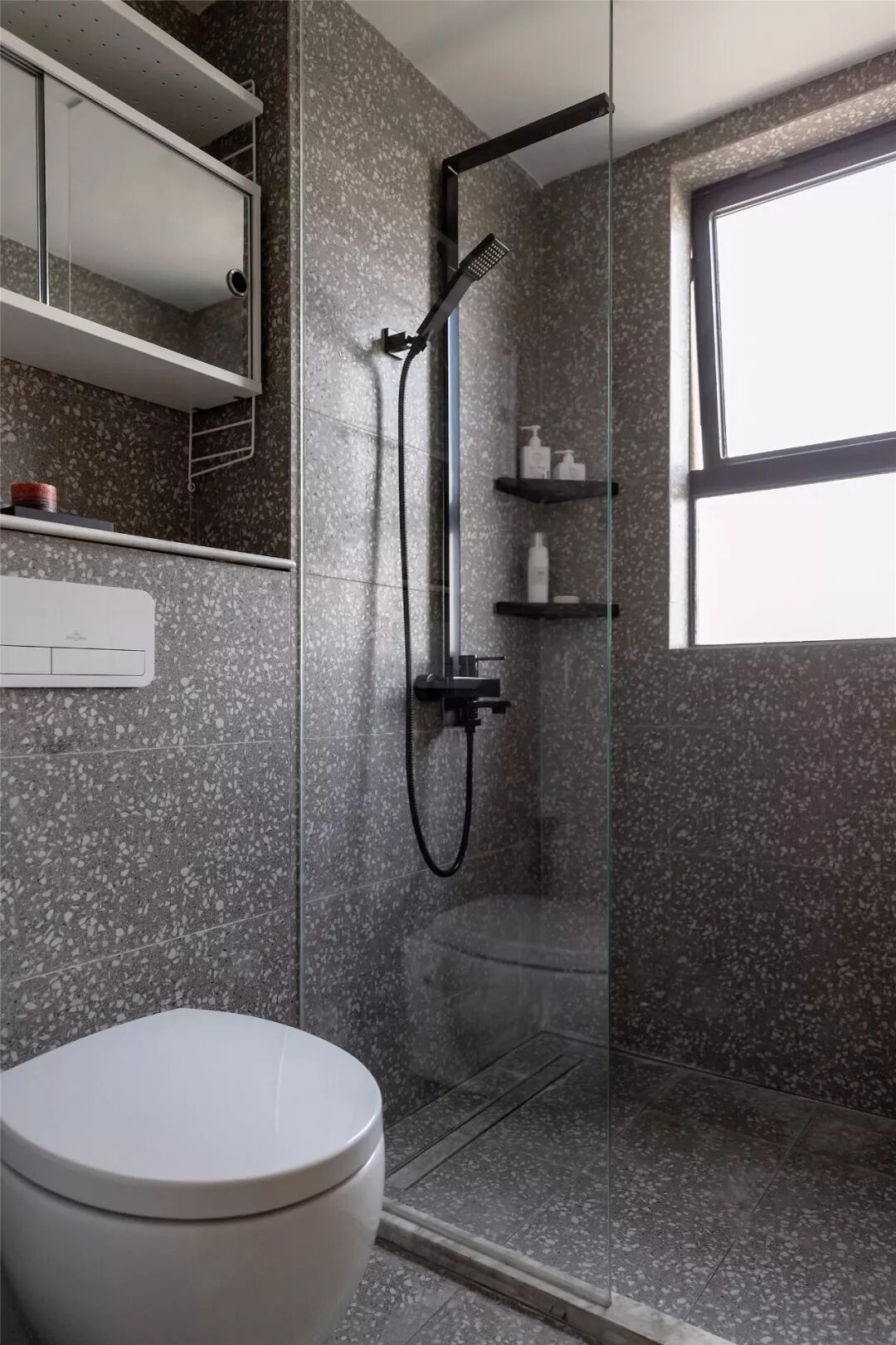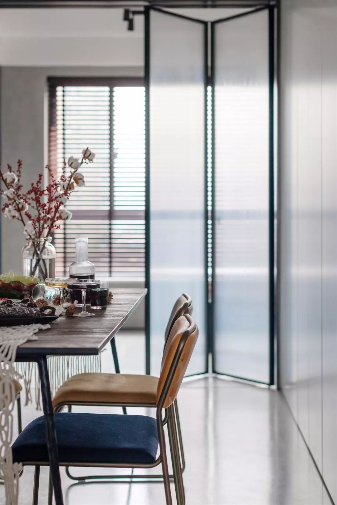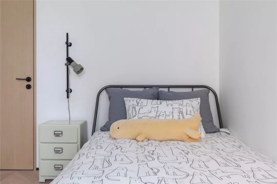 ▲客厅沙发墙以墨蓝色的墙漆,左侧摆上一盆落地盆栽,搭配一张暖灰色布艺沙发,整体给人以端庄沉稳的舒适感。 ▲浅灰色的地面砖,布置上米白色地毯,电视墙旁边还摆放着冰箱,整体空间利用优雅而端庄。 ▲简洁的客厅摆上一张闲适的懒人椅,顶上的灯具也是以导轨灯+射灯的组合,空间显得现代端庄而雅致。 ▲电视墙一个开放的书架,在水泥灰质感的墙面下,布置出一个简洁自然的文艺氛围感。 阳台 ▲客厅打通了阳台,侧边摆着洗衣机+烘干机组合,没有晾晒区的房子,直接就用烘干机烘干衣物,而阳台则是封闭起来纳入到客厅,使得空间更加宽敞。 餐厅 ▲餐厅与客厅连贯的格局,在高冷色调的空间下摆上几张橙色的椅子,让空间清新而活力。 ▲简洁净白的餐边柜,搭配极简大方的餐桌,还有橙蓝配的餐椅,餐桌上丹红的花瓶布置,营造出端庄优雅的用餐气息。 ▲餐厅旁边有个休闲区,以玻璃折叠门隔断,营造出一种简洁温馨的空间氛围。 厨房 ▲厨房也是以水泥灰质感的墙面地面设计,在L形的操作台基础,厨房过道还留了移动操作架与垃圾桶的摆放位置,整体空间实用舒适。 卧室 ▲卧室也是以墨蓝色的床头背景墙,铁艺床+藤椅织篮的靠背,整体简洁现代的设计,给人以安然舒适的休息空间。 ▲床头两侧的吊灯,黑白配的床头柜,还有粉+蓝的窗帘布置,整体空间显得安静优雅而温情。 卫生间 ▲卫生间装了一个简易的成品洗手盆,整体水泥灰质感的墙面,充满了复古调的年代感。 ▲马桶与淋浴区的墙面地面都是以水磨石铺贴,复古调的简约,让空间更加独特情趣。 次卧 ▲简洁的次卧,布置一张铁艺床,床头侧边装了一盏黑色杆壁灯,灰白配的床单布置,小空间也舒适惬意。 休闲室 ▲休闲室整体灰色调的空间,在百叶帘的窗帘下,摆上一张橙色的休闲椅,让空间充满年轻简约与激情的活泼感。