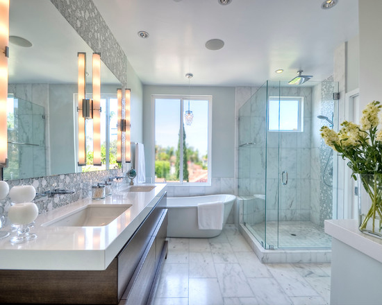 小编的话:大户型浴室首先在面积上占据了优势,玻璃隔断与诸多镜面给空间更多的通透,米白大理石台盆和浅到冷的蓝色墙面给人在夏日里一抹清凉视觉。在必要的装饰之外,偏于简约的设计也带来不少清凉感。